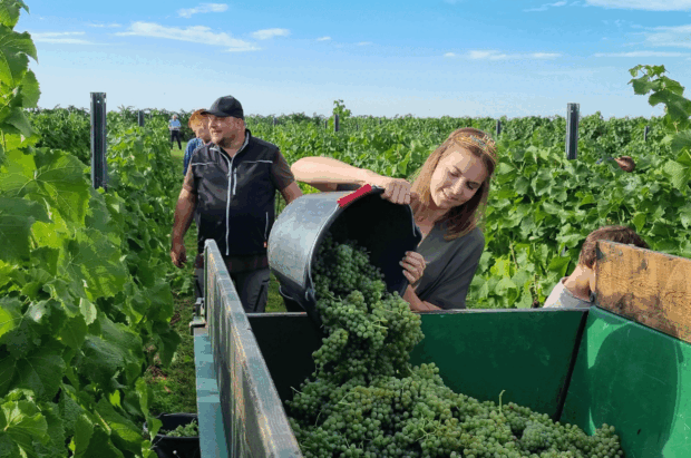 Foto (DWI): Die Pfälzische Weinkönigin 2023 Lea Baßler bei der Lese der ersten Trauben des Jahres in der Nähe von_Neustadt.