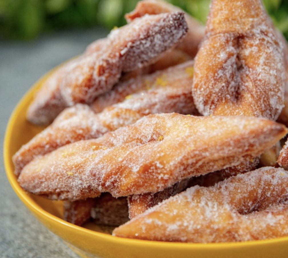 Wenn der Teig gut durchgezogen ist, werden die Bugnes in Öl bei 180°C frittiert. Nach dem Backen auf Küchenpapier legen. Für noch mehr Genuss in Zucker wälzen und mit etwas Zitronenzeste bestreuen.